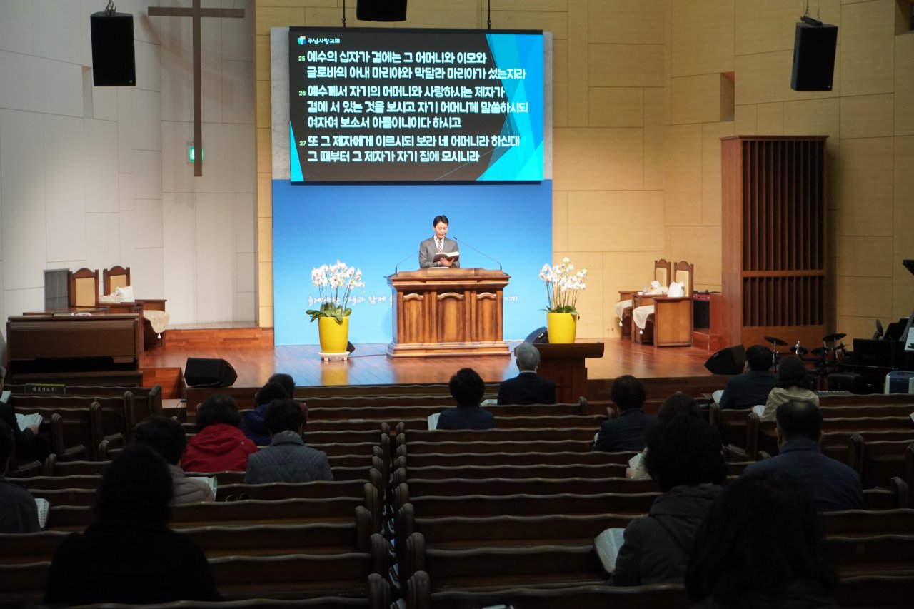 예수께서 자기의 어머니와 사랑하시는 제자가 곁에 서 있는 것을 보시고 자기 어머니께 말씀하시되 여자여 보소서 아들이니이다 하시고